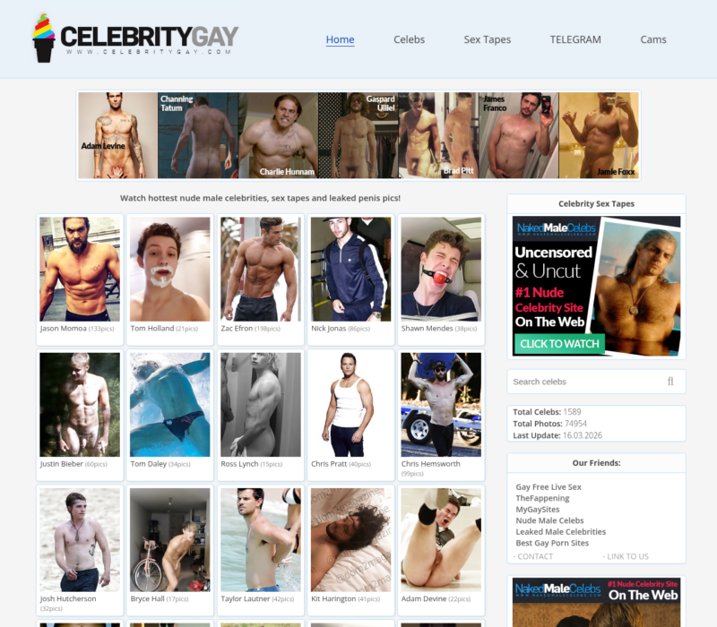 - CelebrityGay.com boasts a stunning design that's both visually appealing and easy to navigate, making your browsing experience a The site offers a vast collection of erotic content featuring some of the hottest male celebrities, ensuring there's With over 1,500 nude pictures and 2,000 sex tapes, you'll have more than enough eye candy to keep The user-friendly interface allows you to find your favorite celebrities with ease, thanks to its well-organized sections and The site is mobile-friendly, so you can enjoy the content on the go, making it perfect for quick CelebrityGay.com provides a safe space for gay audiences to explore their desires and satisfy their curiosities without judgment.