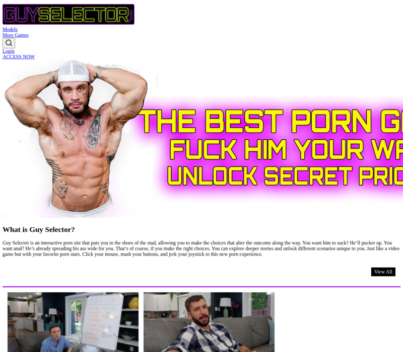 • GuySelector features a diverse cast of gorgeous men, ensuring there's someone for everyone's taste. The site offers excellent interactivity, allowing users to make choices that influence the story, making the experience more With a $1 trial, it's decently affordable to check out before committing to a full subscription. The high-quality production and stunning environments create a premium feel that enhances the viewing experience. The variety of body types and racial diversity adds to the appeal, making it easier for users to