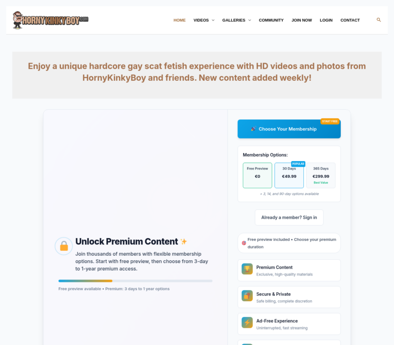 Hornykinkyboy.com is a niche site dedicated to scat porn and other hardcore fetishes, catering to a gay audience. The site offers a variety of explicit videos and galleries, featuring everything from scat content to BDSM and unusual fetishes. With a simple, clean design and a focus on its niche, the site provides a unique experience for those interested in these specific kinks. Content is presented unconventionally, with a scrolling homepage offering previews. To access all content, users need to create an account, and a premium membership is available for exclusive content, weekly updates, and ad-free viewing. Prices are reasonable, with options for 30, 90, and 360-day memberships. While not for everyone, it's a treasure trove for those who enjoy scat and fetish content.