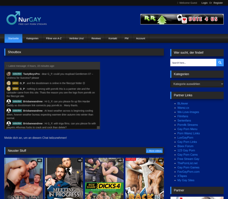 Nur Gay is a free, no-registration German gay porn site offering HD videos with captivating titles and descriptions. It features a variety of categories, including amateur, BDSM, and muscle, with content that is easy to navigate and stream quickly. The site, which has been active for about five years, provides sorting options and links to related content, enhancing the user experience. Despite its basic design and occasional disruptive ads, Nur Gay offers a wide array of erotic scenes with handsome actors, ensuring a satisfying viewing experience for gay men and enthusiasts.