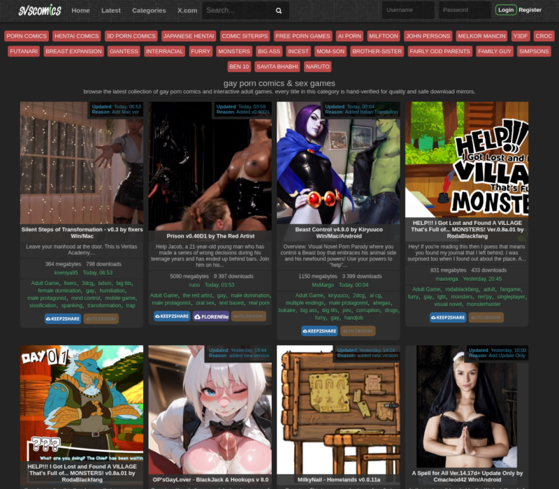 Svscomics.com is a treasure trove of kinky comics and games, offering a diverse range of content from hentai to 3D comics. The site features a special section for gay content, including yaoi game comics, and boasts over 280 naughty comics with regular updates. Users can create a free account to upload and share their own stories, joining a community of over 200,000 members. While the site has a simple design and a variety of categories, the user experience could be improved, especially with the search and viewing options. Despite these drawbacks, svscomics.com is a go-to destination for those seeking explicit art and steamy stories, providing a platform to explore wild fantasies and connect with like-minded individuals.