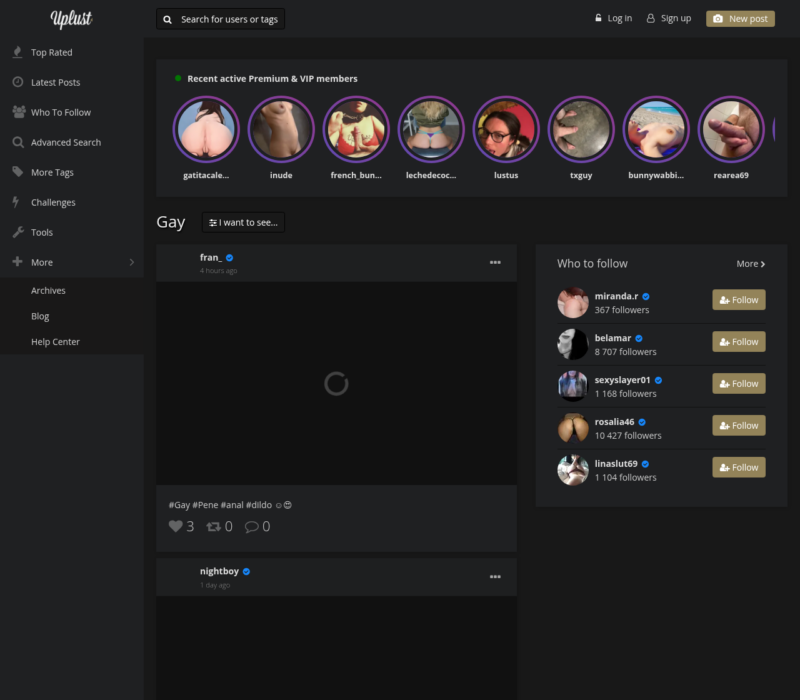 • Uplust offers a vast collection of amateur gay porn images and videos, catering to a wide range of The platform features a sleek and user-friendly interface, making it easy to navigate and find the content you're You'll find an abundance of dick pics and pretty buttholes, ensuring there's always something to get you going. Uplust has an active user community, which means you'll always have fresh content to explore and new people The mobile interface is excellent, allowing you to enjoy the platform on the go without any hassle.