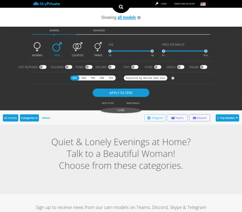 • Offers private Skype sex shows and Discord chats for a more intimate experience. Provides dozens of live male models at any given moment, ensuring variety. Boasts thousands of models in total, giving you a wide range of options to choose from. Features a comprehensive set of filters to help you find your perfect match easily. Offers a fair amount of free amateur porn, which can be a great teaser before committing to a Doesn't require an account to start chatting, making it convenient for first-time users.